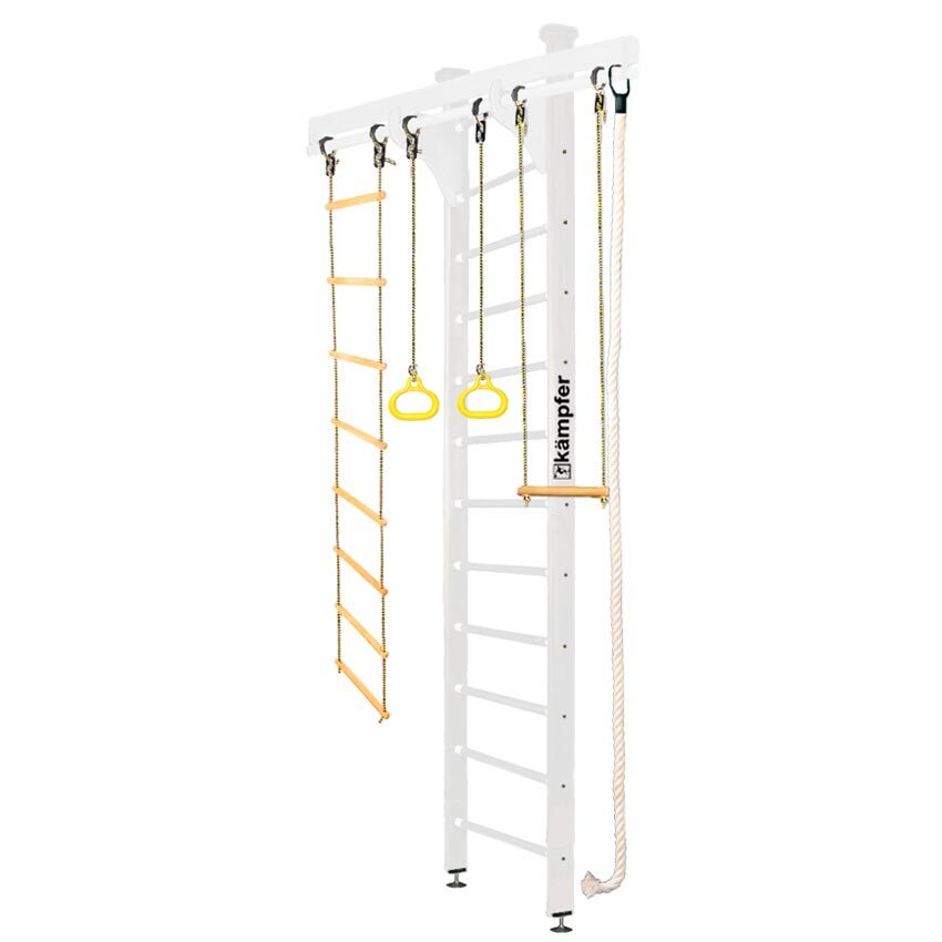 Шведская стенка для детей Kampfer Wooden Ladder Ceiling состоит из комфортной по ширине шведской стенки с удобным для детей расстоянием между ступенями и самых популярных у детей навесных спортивных снарядов - гимнастических колец, трапеции, каната и веревочной лестницы. Благодаря конструктивным особенностям детского спортивного комплекса Kampfer Wooden Ladder (ceiling) все снаряды всегда находятся на виду и в легкой доступности. И тем самым постоянно привлекают к себе внимание ребенка.