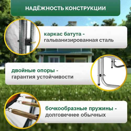 | Комплектация | Батут, Защитный мат, Защитная сетка, Нижняя сетка, Лестница |