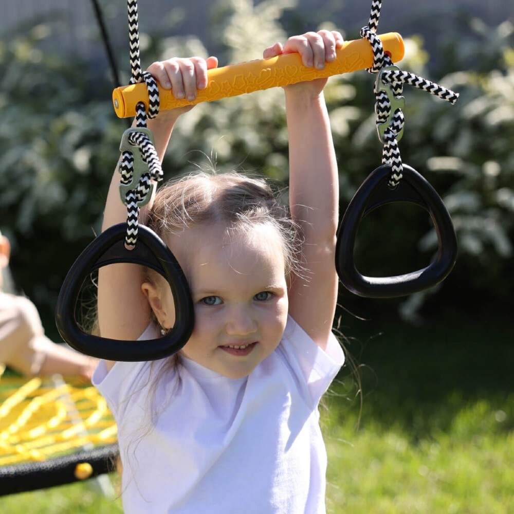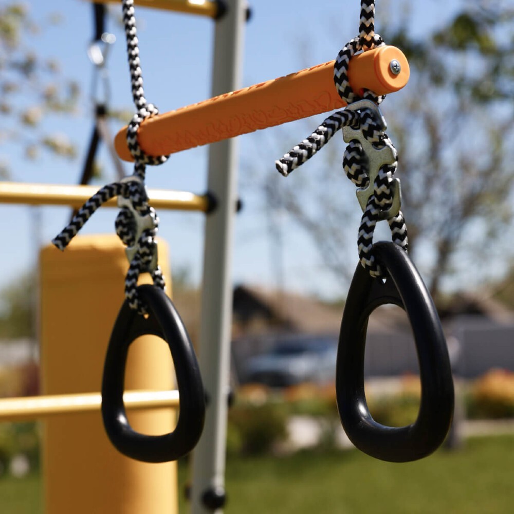 Кольца с перекладиной для уличных ДСК Романа - это сразу два снаряда в одном. А что, очень удобно. Место на спортивном комплексе экономится, а возможности увеличиваются сразу в два раза. Крепится аксессуар легко и просто. Его просто надо привязать к любой верхней перекладине комплекса, но так, чтобы вокруг него было достаточно свободного пространства. Думаем, что не откроем Вам какой-то страшной тайны, сказав, что большую часть времени дети используют этот снаряд не по прямому назначению. Они просто на них качаются всеми мыслимыми и немыслимыми способами. Ну и пусть! Зато весело!