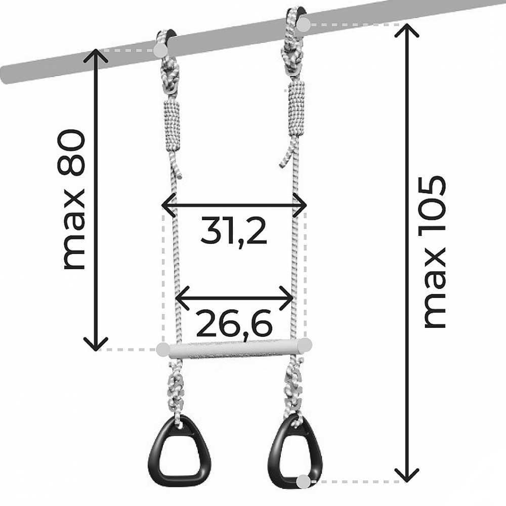 | Конструктивные особенности | Кольца - пластик, 15 х 15 х 2.5 см. Перекладина - пластик Веревка 105 х 1 см, полипропилен Металлические фиксаторы для регулировки высоты - 2 шт. |