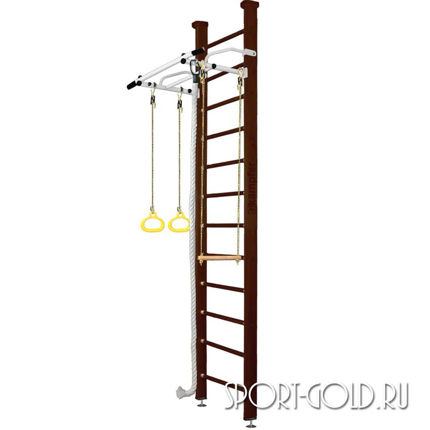 Детский спортивный комплекс Kampfer Helena Ceiling - это элегантная и экологичная деревянная шведская стенка с металлическим турником и классическим набором навесных спортивных аксессуаров. Конструкция устанавливается враспор между полом и потолком, поэтому расположить ДСК можно абсолютно в любом месте помещения - поставить его вплотную к стене, сделать его угловым комплексом или установить по центру комнаты и вовсе не обязательно параллельно к стенам.