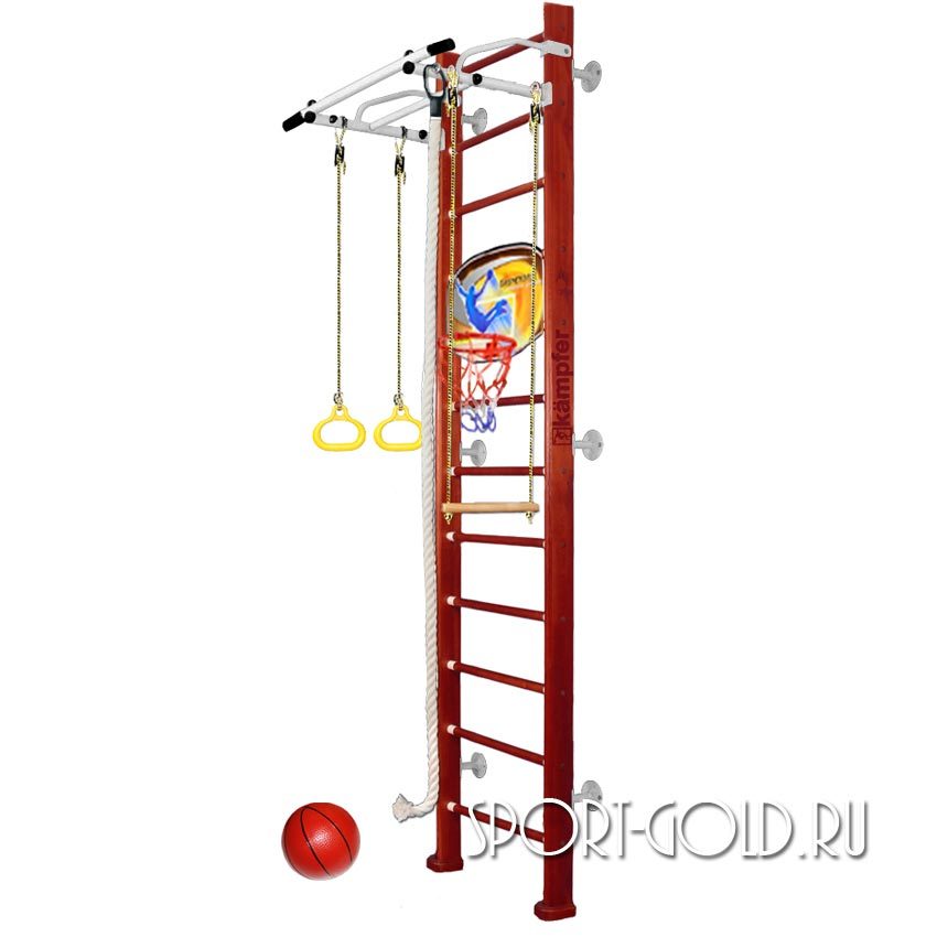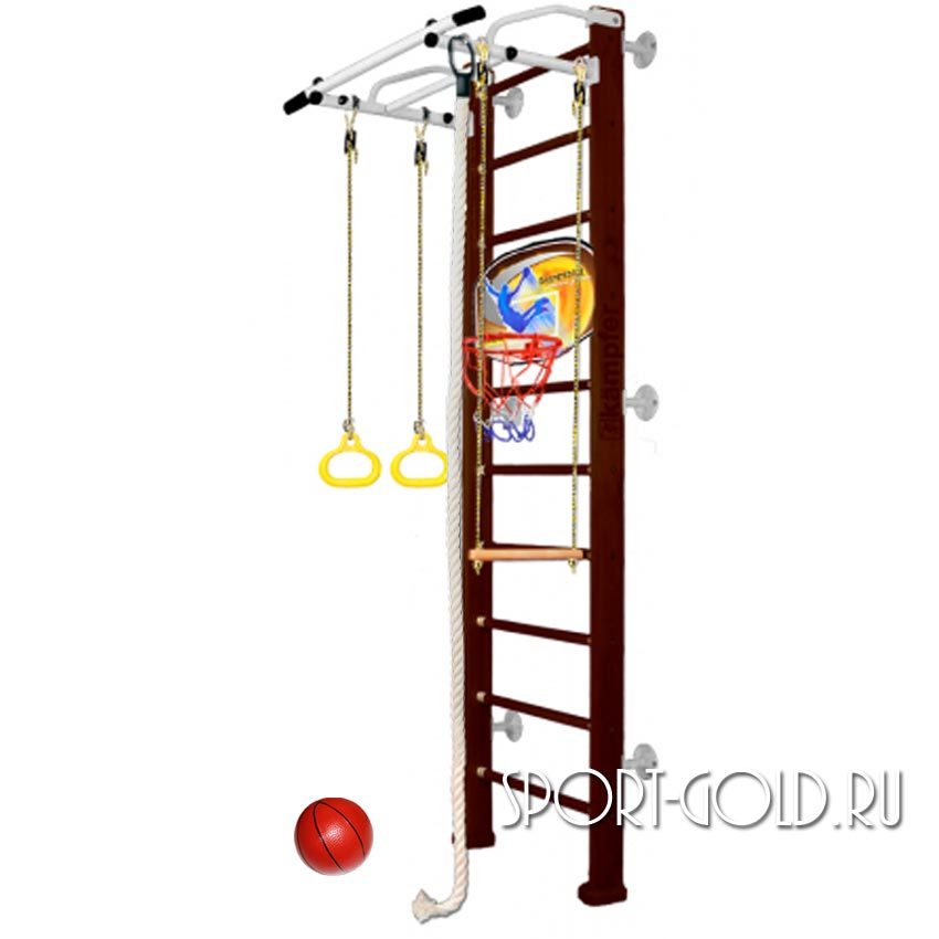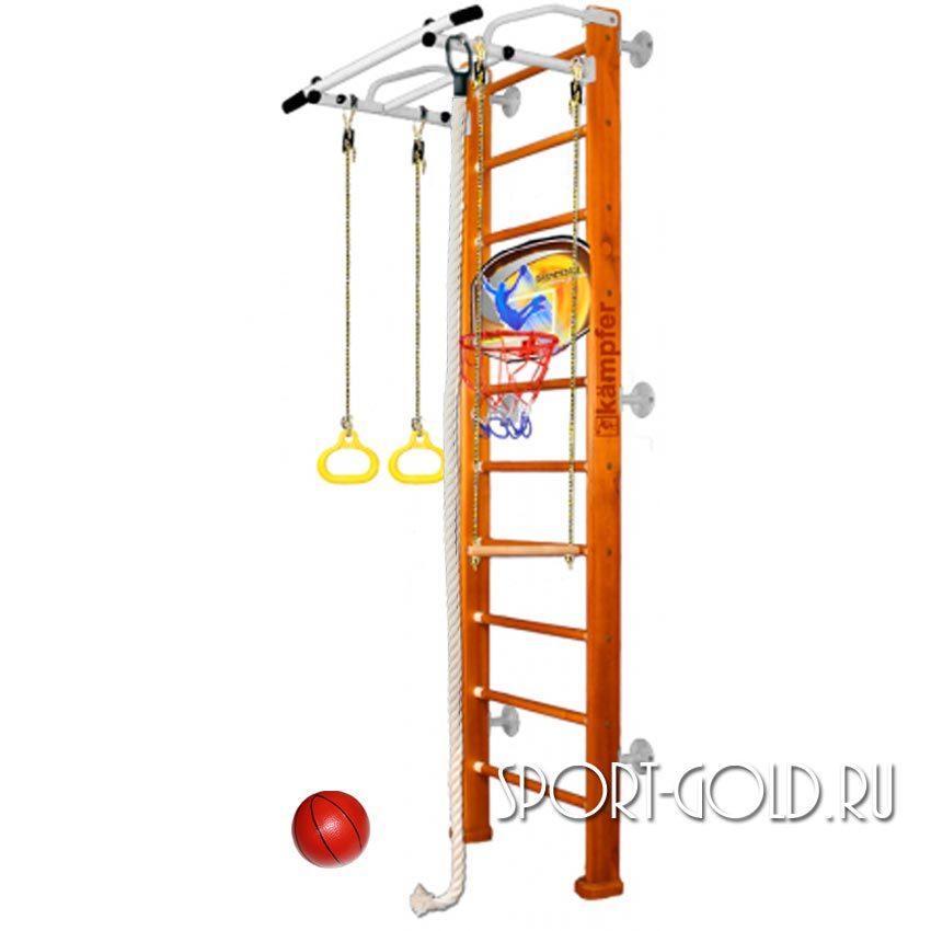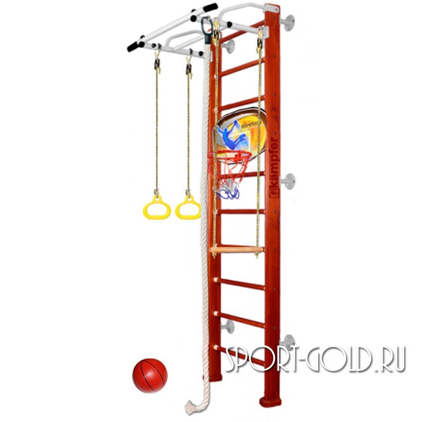 Детский спортивный комплекс Kampfer Helena Wall Basketball Shield – самый наполненный по спортивным аксессуарам вариант популярнейшей модели деревянного ДСК Helena, к которому добавили баскетбольное кольцо с мячом. Свое признание модель заслужила за счет классической формы, функциональности, качества, экологичности и высокой надежности. Шведская лестница выполнена из высококачественной древесины с итальянским покрытием Coatings Italia S.p.a. Края всех стоек и опор мягко закруглены. Собирается комплекс с помощью болтов и саморезов. Крепежные отверстия закрываются пластиковыми заглушками. Все продумано и для детей не травмоопасно.