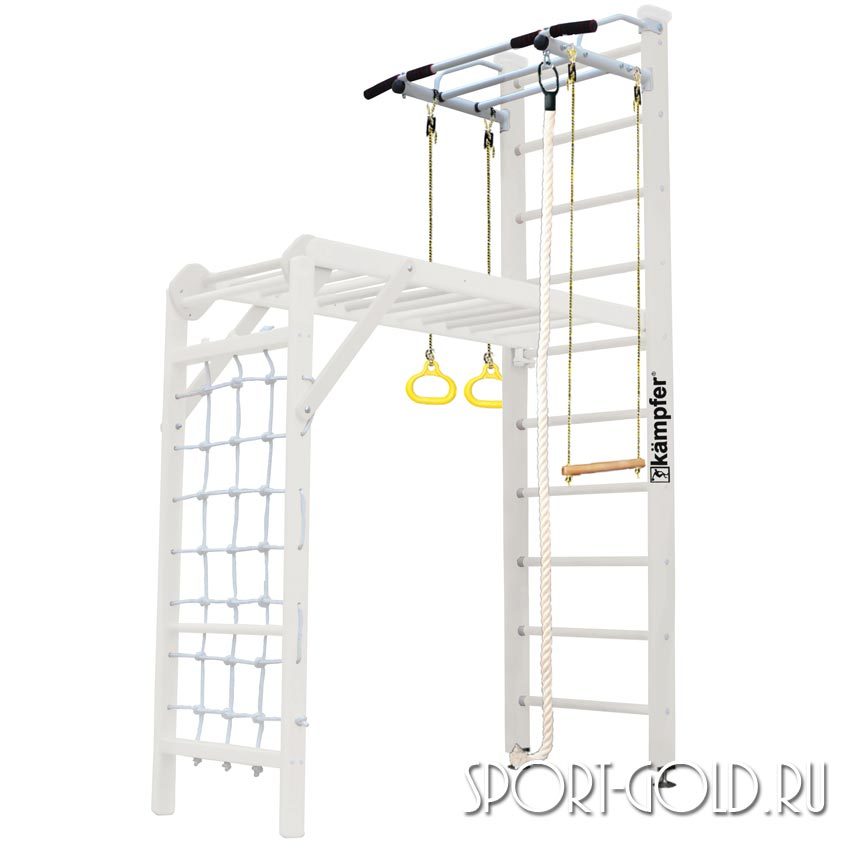 Детский спортивный комплекс Kampfer Union Ceiling - это оригинальная шведская стенка, состоящая из классической деревянной лестницы, металлического турника, трех навесных спортивных аксессуаров и мобильного элемента с сеткой и лесенкой. Прелесть этого элемента в том, что его можно установить на ступень шведской лестницы (будет вертикальная сетка и рукоход), или использовать как отдельно стоящий напольный модуль для малышей от 1 до 4 лет (получится наклонная сетка и частая лесенка). В отличии от остальных элементов комплекса, этот модуль рассчитан на нагрузку только до 50 кг.