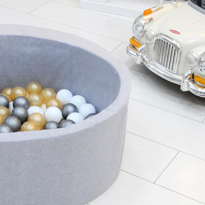 Сухой бассейн с шариками Perfetto Sport Alba PS-528 нейтрального серого цвета с белыми, серыми и золотыми шариками впишется в интерьер любой детской комнаты. Мягкая чаша из поролона с трикотажной обшивкой создаст уютное пространство для игры и бережно поддержит малыша, если он вдруг попробует упасть.