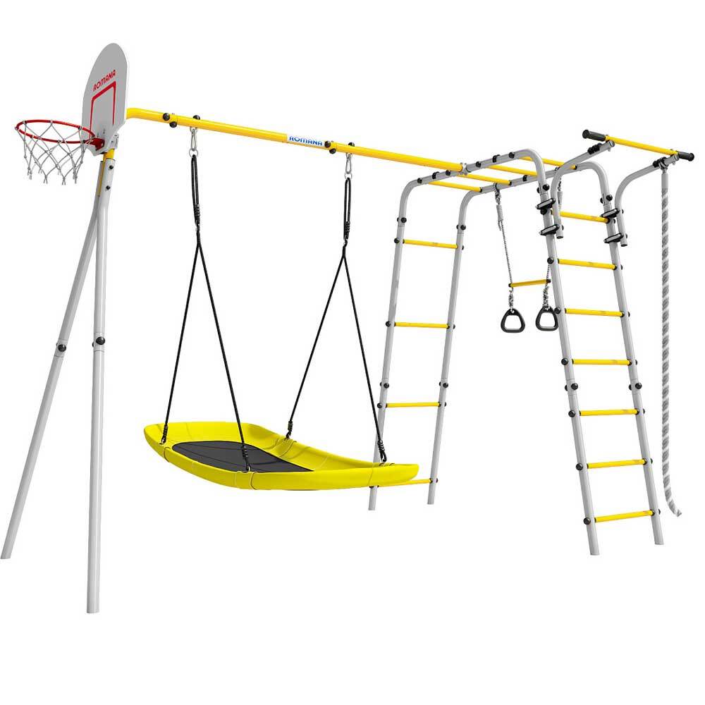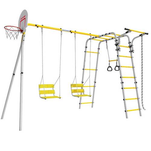 | Комплектация | Гимнастические лестницы - 2 шт, Турник подвижный, Рукоход, Канат, Кольца с перекладиной, Качели - 2 шт, Баскетбольное кольцо |