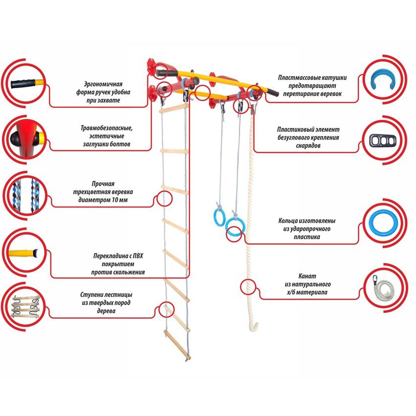| Комплектация | Турник настенный, Веревочная лестница, Канат, Кольца |