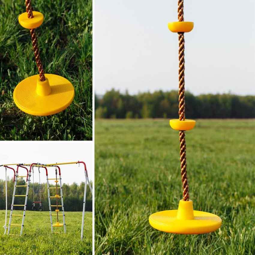 ROMANA Качели Диск - это пластиковый диск на канате с зацепами. То есть, сразу два снаряда в одном. Хочешь - лазай по канату, а хочешь - качайся. При этом качаться можно как сидя, так и стоя. Здорово!