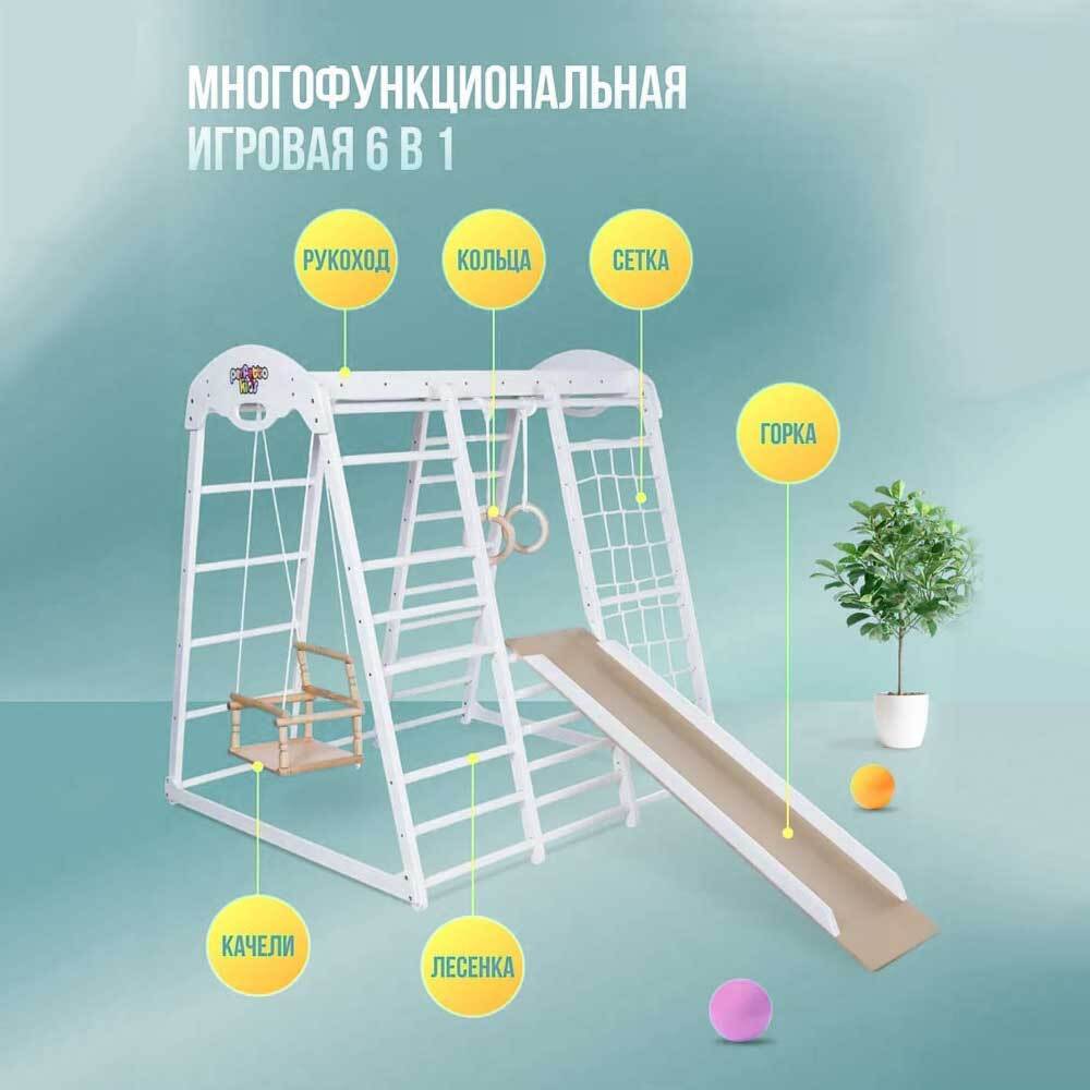 | Комплектация | Гимнастические лестницы - 4 шт, Горка, Канатная сетка, Качели, Кольца, Рукоход |