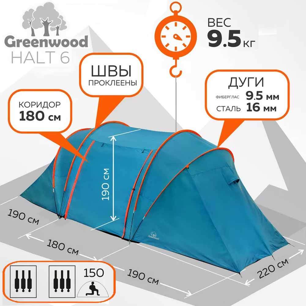 Кемпинговая палатка GREENWOOD HALT 6 синяя — 6-местная 2-комнатная модель высотой 190 см, созданная для комфортного отдыха на природе. Внутри расположены два спальных отсека из дышащего полиэстера. В каждом из них достаточно места для 3 человек. Входы оборудованы противомоскитными сетками и закрываются на молнию.