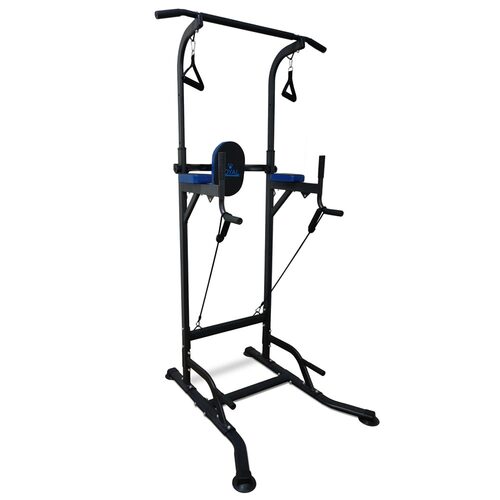 Турник-пресс-брусья ROYAL FITNESS HB-DG006 с эспандерами - многофункциональная силовая стойка для подтягиваний, отжиманий и тренировок на сопротивление в домашних условиях. Тренажер напольный, что очень удобно. В нем собраны 4 тренировочных элемента - это практично.