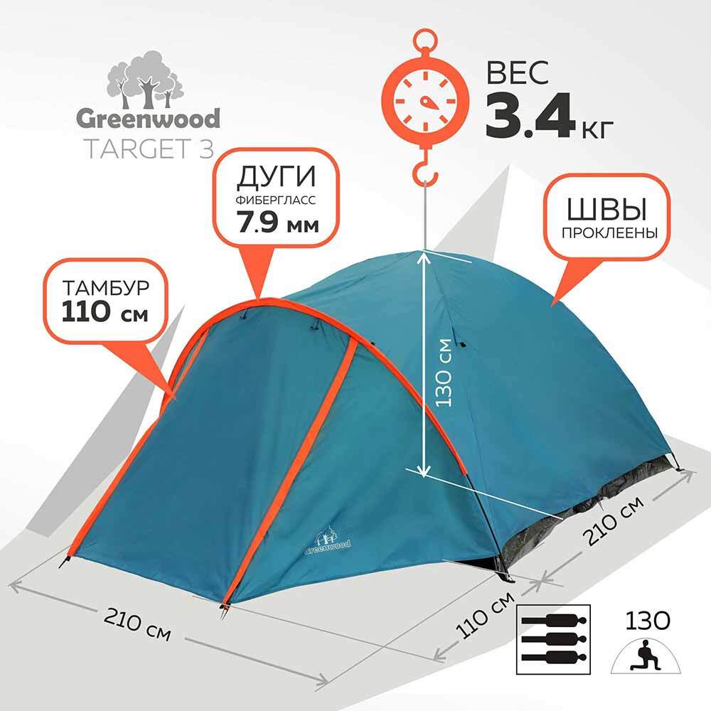 Туристическая палатка GREENWOOD TARGET 3 синяя – компактная и легкая 3-местная, 1-комнатная, 2-слойная модель, которая всего за несколько минут обеспечит Вам надежную крышу над головой. Идеальный вариант для несложных туристических походов, автомобильных путешествий и загородного отдыха в средней полосе.