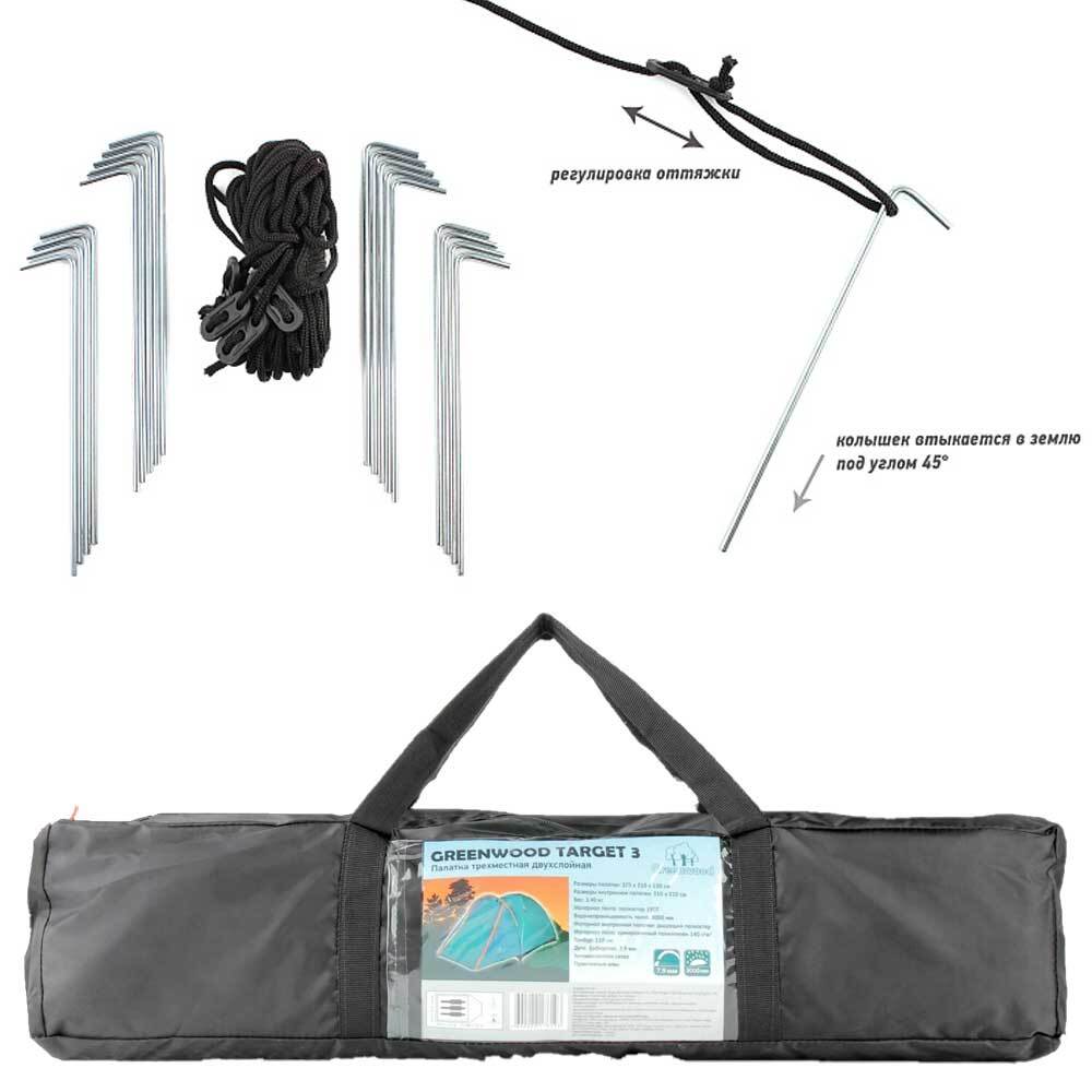 3-х местная палатка GREENWOOD TARGET 3 устанавливается в течение нескольких минут с помощью быстросборного каркаса из фиберглассовых дуг и крепится к земле на растяжках. Весит палатка всего 3.4 кг, поэтому может оказаться оптимальным переносным домиком для пеших и автотуристов.