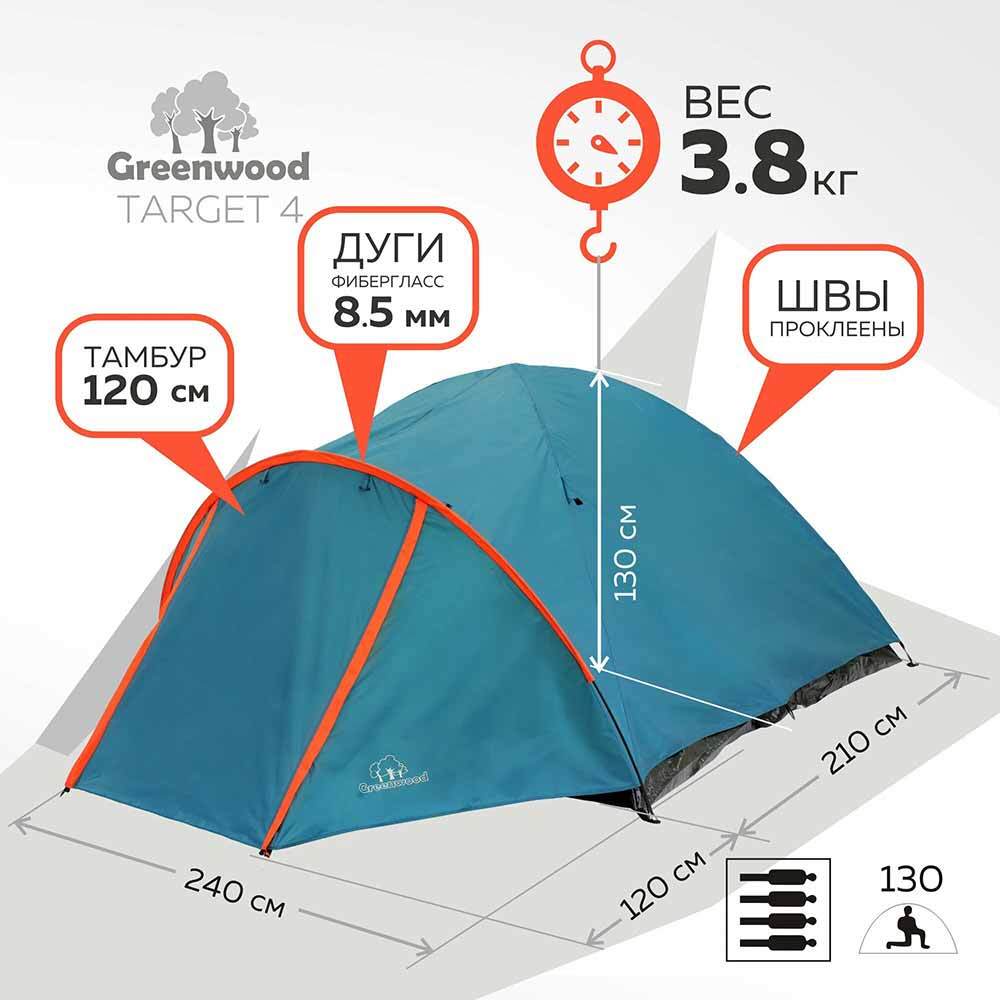 Палатка GREENWOOD TARGET 4 синяя — классическая 4-местная 1-комнатная 2-слойная палатка для несложных туристических походов и загородного отдыха в средней полосе. Довольно просторный спальный отсек оборудован внутренней палаткой из дышащего полиэстера и рассчитан на комфортное размещение 4-х человек.